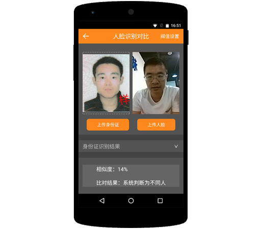 通过移动端拍摄手持身份证视频,利用人脸检测技术抓取真人和身份证上人脸进行比对,核查身份证是否为持证人本人。